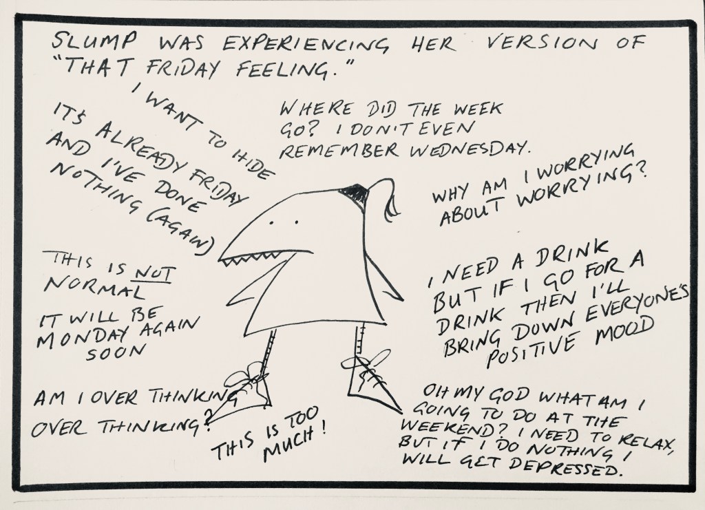 She couldn’t stop thinking: Where did the week go? I don’t even remember Wednesday. Why am I worrying about worrying? I need a drink but if I go for a drink then I’ll bring down everyone’s positive mood. I want to hide. It’s already Friday and I’ve done nothing (again). This is NOT normal. It will be Monday again soon. Am I over thinking over thinking? I need a drink but if I go for a drink then I’ll bring down everyone’s positive mood. Oh my god, what am I going to do at the weekend? I need to relax, but if I do nothing I will get depressed.This is too much.