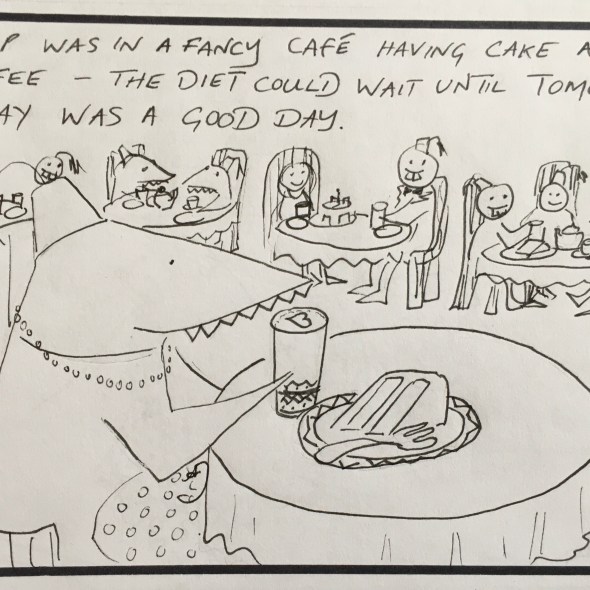Slump was in a fancy cafe having cake and coffee